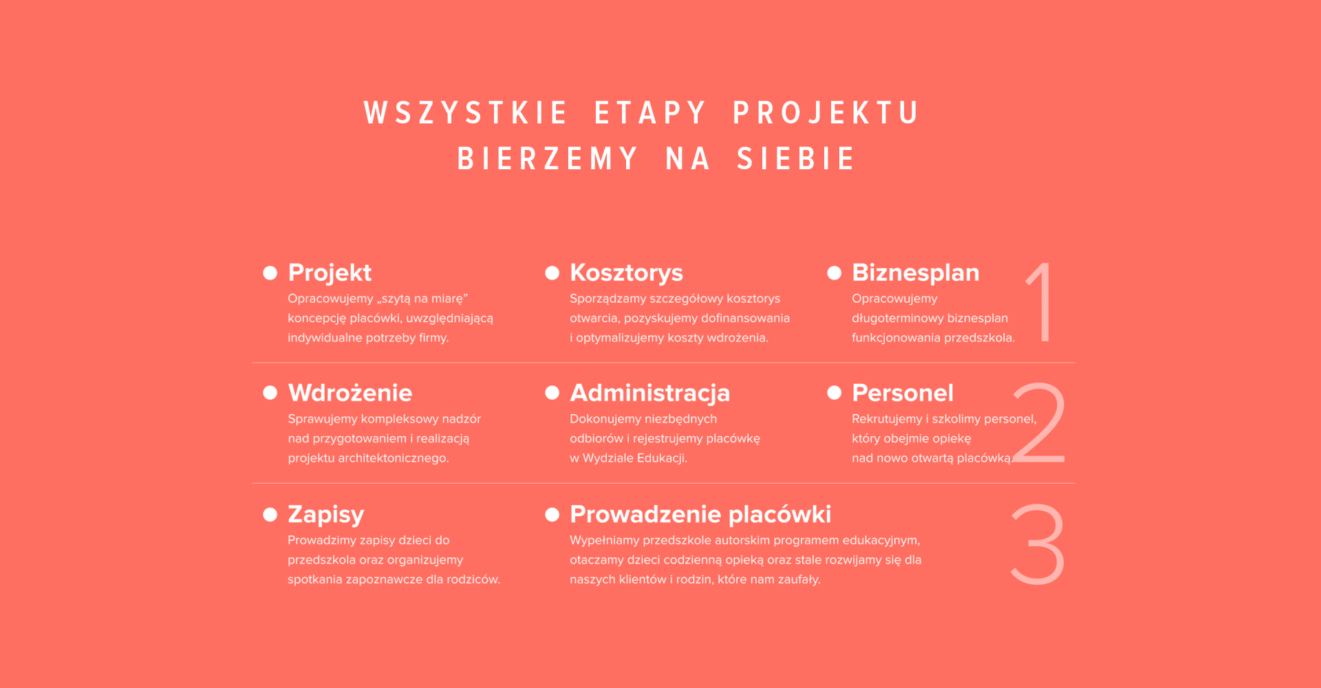Projektując przedszkole, bierzemy pod uwagę wielkość zatrudnienia, budżet oraz dostępność przestrzeni do zagospodarowania. Przyjmujemy model współpracy dopasowany do możliwości i wymagań konkretnej firmy.