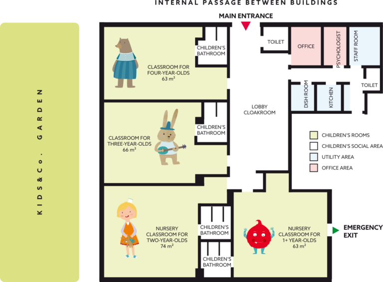 The interiors of our preschool and nursery are modern and spacious, designed with children’s development in mind. The KIDS&Co. preschool and nursery in Katowice features four rooms—two nursery rooms and two preschool rooms. Children have access to a recreational area in close proximity to the facility, and parking spaces are provided for parents.
