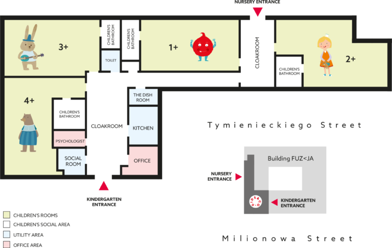 The interiors of our preschool and nursery are modern and spacious, designed with the child’s development in mind. The KIDS&Co. preschool and nursery in Łódź feature four rooms—two for nursery groups and two for preschoolers. The development area includes a public playground, and public parking spaces for parents are available around the buildings.