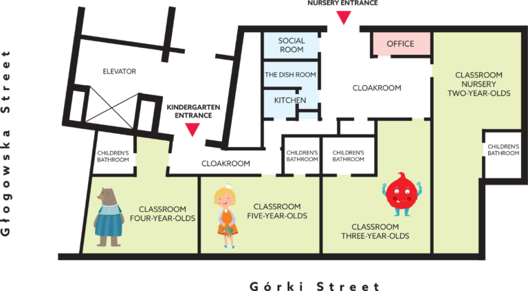 The interiors of our preschool and nursery are modern and spacious, designed with the child’s development in mind. The KIDS&Co. preschool and nursery in Poznań feature four rooms—two for nursery groups and two for preschoolers. Children have access to a playground, and rotational parking spaces are available for parents.