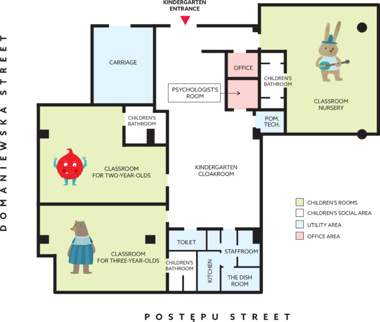 The interiors of our preschool and nursery are modern and spacious, designed with the child’s development in mind. The KIDS&Co. preschool and nursery in Warsaw feature three rooms—one for nursery groups and two for preschoolers. Children have access to a playground within the office complex, and parking spaces are available for parents.